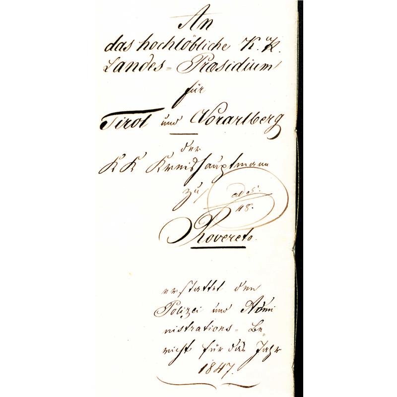 „Die häufig nach Italien hin und her ziehenden Land und Gewerbsleute Südtirols äußern unter Weges so bösartige Gesinnungen gegen die Regierung […]“ (Wenzel Ritter von Kronenfels, dirigierender Polizei Oberkommisar in Trient an Jakob Hahn, wirkl. Gubernialrat und Polizeidirektor in Innsbruck, Trient am 24. Februar 1831)