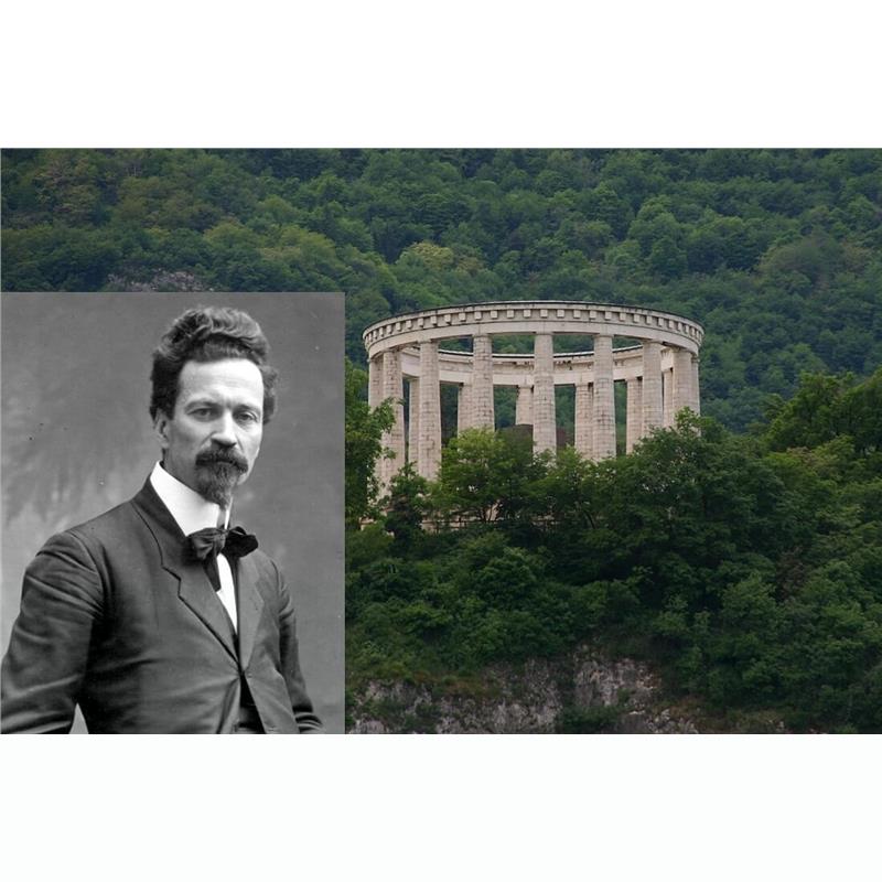 Collage: Cesare Battisti (links), im Hintergrund das Battisti-Mausoleum bei Trient (Quelle: Paolo Deimichei https://it.m.wikipedia.org/wiki/File:Il_Mausoleo_di_Cesare_Battisti,_a_Trento.jpg)
