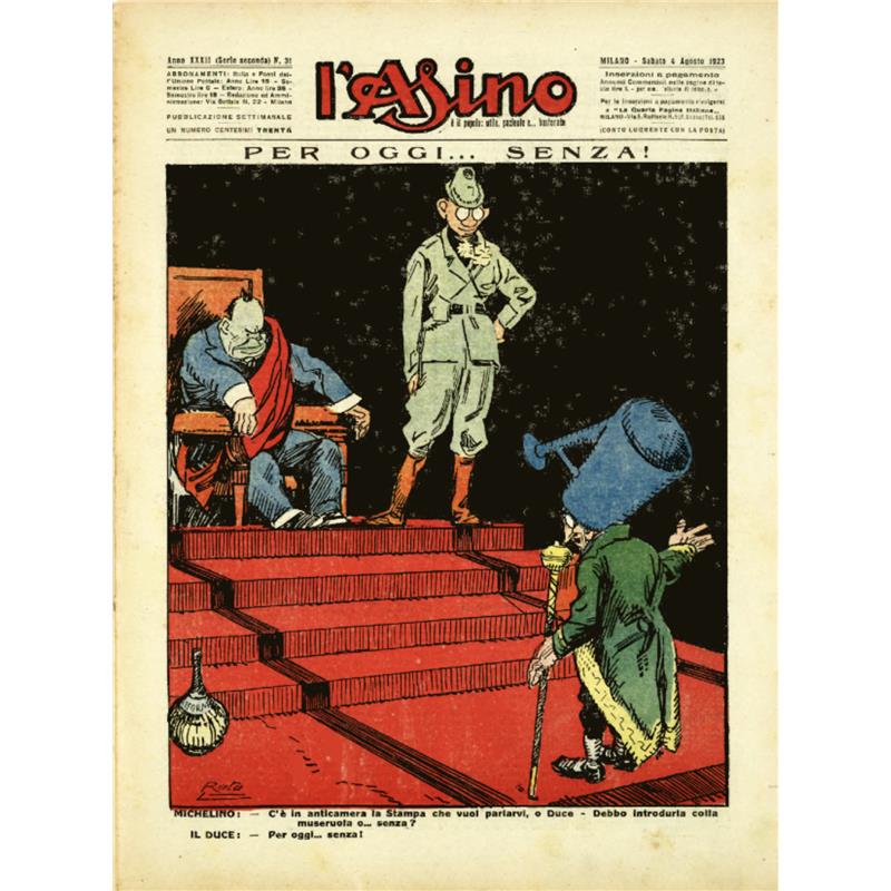 Michelino: „Im Vorraum wartet die Presse, die Sie sprechen will, Duce – Soll ich sie mit oder ohne Maulkorb hereinführen?“ Duce: „Heute einmal …ohne!“