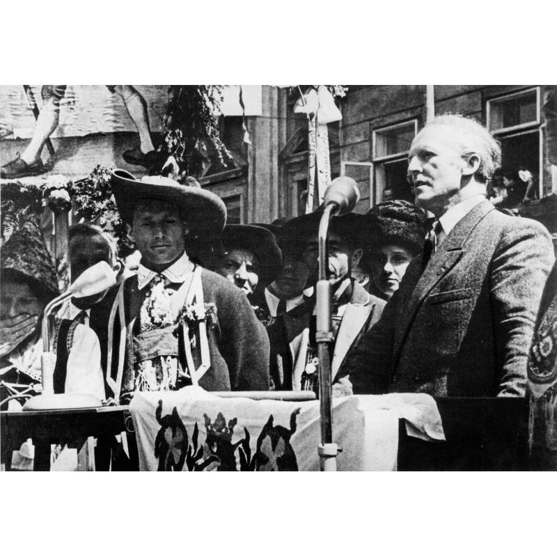 Bild: Prof. Reut-Nicolussi bei einer Kundgebung zur Wiedervereinigung Südtirols mit Österreich, Linz 1946 – Quelle: Bildarchiv Austria, Österreichische Nationalbibliothek
