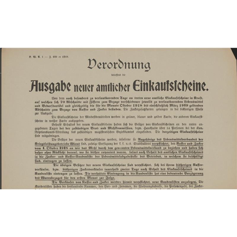 Symbolbild: Einkaufsscheinverordnung, Wien, 26.8.1918 – public domain
