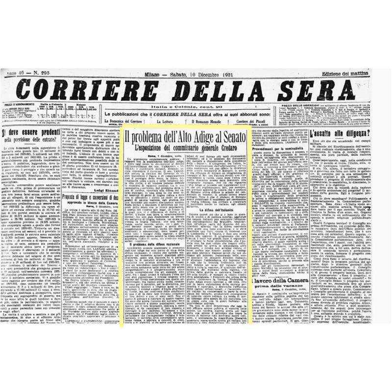 La rubrica Historegio "fonte del mese" propone per il mese di novembre 2021 l’analisi del discorso del commissario generale civile per la Venezia Tridentina Luigi Credaro al Senato del dicembre 1921. Si tratta di una delle poche occasioni in cui l’Alto Adige fu oggetto di discussione nel parlamento dell’Italia liberale. Il dibattito, che finì sulle prime pagine dei quotidiani, metteva qancora una volta in evidenza le difficoltà della politica italiana in Alto Adige.