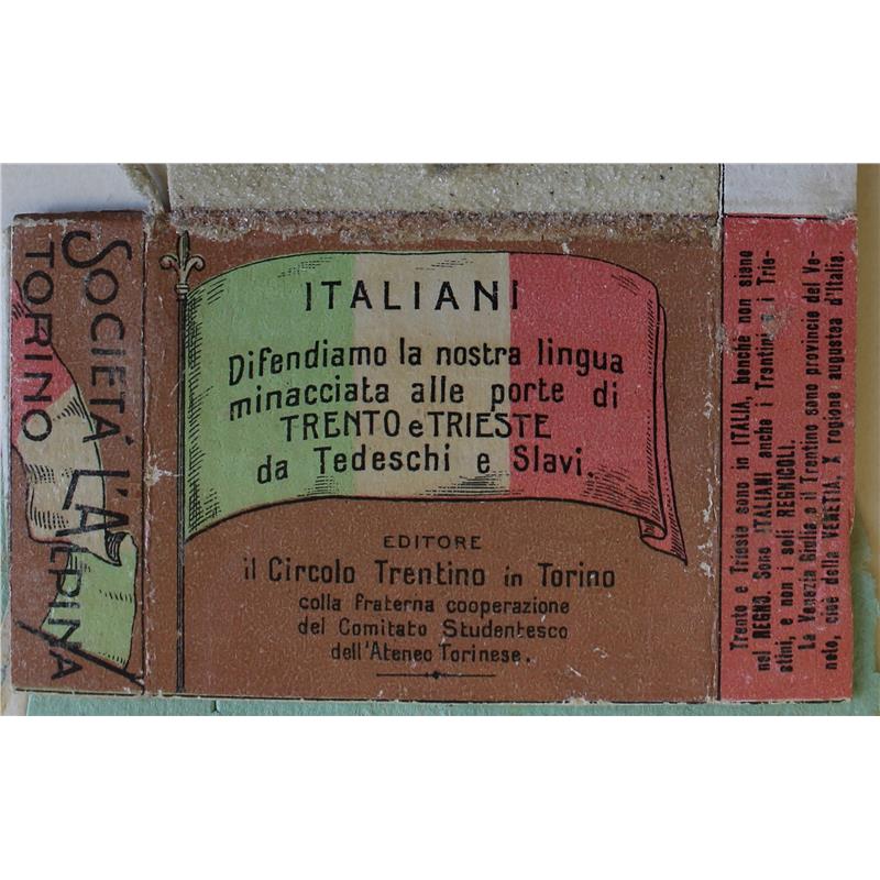 La scatola dei fiammiferi qui riportata in fotografia fu realizzata alla fine di luglio 1910 dal Circolo Trentino di Torino e con il supporto di un comitato studentesco dell'Università di Torino. Il ricavato della vendita probabilmente - secondo gli archivi dell'Archivio Politico del Ministero degli Affari Esteri austriaco - andò all'Associazione (pro) Trento e Trieste, fondata nel 1903 e dedicata alla difesa e alla conservazione dell'italianità.