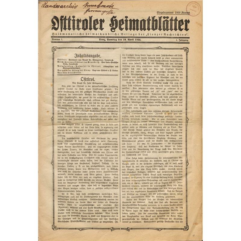 "Il Tirolo Orientale ha sempre svolto il ruolo di figliastro nella ricerca storica locale della nostra regione", scriveva il prevosto Dr. Josef Weingartner nella prima edizione degli “Osttiroler Heimatblätter” nell'aprile del 1924. L'obiettivo di questo supplemento di storia locale delle "Lienzer Nachrichten" era quindi quello di "aprire la strada all'idea di Heimat anche in altri ambienti popolari del Tirolo Orientale", come annunciava il quotidiano tirolese dell'epoca il 19 aprile: