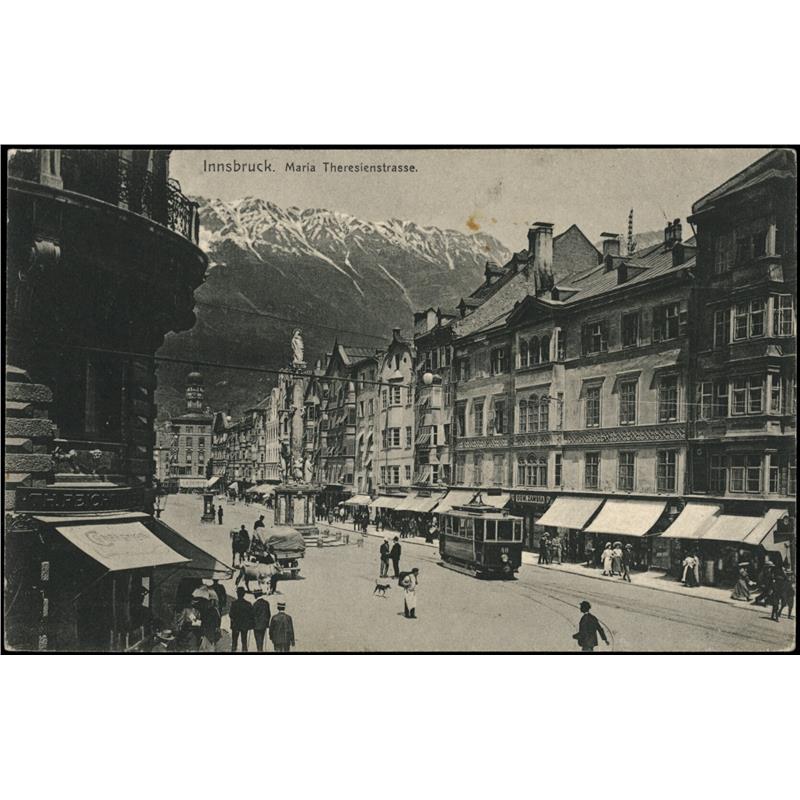 Immagine: Cartolina della Maria-Theresien-Straße a Innsbruck, circolata del 1908 (edizioni Gratl) – fonte: AKON, Österreichische Nationalbibliothek