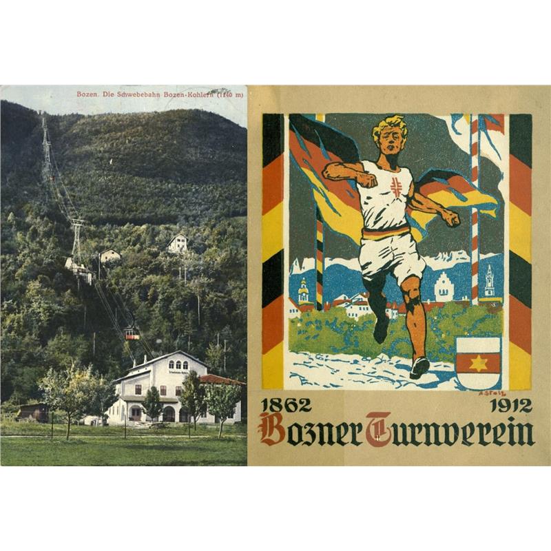 Collage (da sx a dx): Cartolina della "Schwebebahn Bozen Kohlern" [funivia del Colle], circolata nel 1913 – fonte: AKON, Österreichische Nationalbibliothek; Copertina dello scritto commemorativo per il 50esimo anniversario del Turnverein Bozen