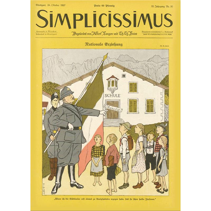 Caricatura dalla rivista satirica “Simplicissimus” sulla politica scolastica fascista in Sudtirolo, 24 ottobre 1927