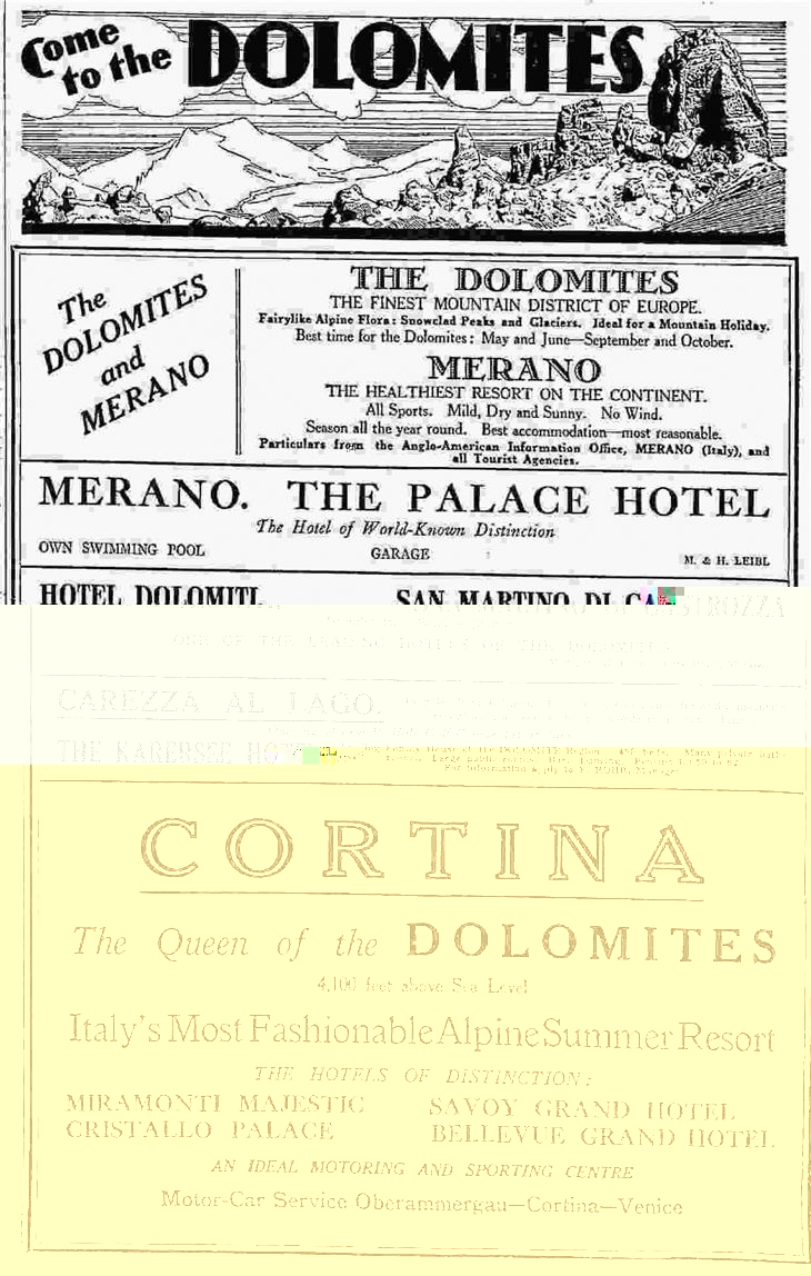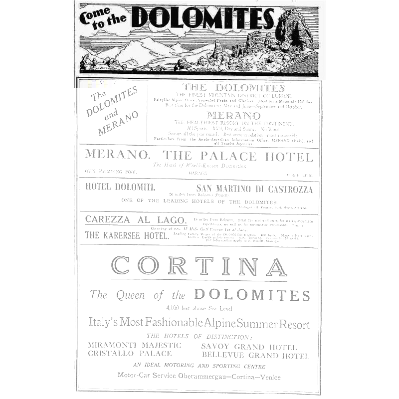 Da inizio Novecento in poi, l’automobile era stata protagonista di un’ascesa repentina che l’aveva portata ad affermarsi come mezzo di circolazione moderno per eccellenza. La diffusione di autovetture in Tirolo procedette inizialmente con relativa lentezza. Nel 1911, sulle 7703 macchine circolanti in Austria, solo 361 erano registrate in Tirolo. Nel 1927, dopo il passaggio della Sudtirolo all’Italia, si contavano nella “Venezia Tridentina” 989 vetture private, una cifra superiore solo a Basilicata e Sardegna e di gran lunga inferiore alle 22.918 automobili lombarde. L’impatto dei mezzi a motore sul turismo, che all’epoca interessava solo le classi abbienti, si rivelò però subito essere di enorme portata. Da un lato essi permettevano di scegliere destinazioni turistiche non raggiungibili in ferrovia e di farlo facilmente e in tutta comodità, facendo uso tanto di mezzi privati che predisposti attraverso un servizio pubblico. L’inserzione qui riprodotta, per esempio, pubblicizza sia i garage dei grandi alberghi, che un servizio taxi tra Cortina e i centri turistici di Venezia e Oberammergau in Baviera. Dall’altro lato, la possibilità di muoversi in modo rapido e indipendente lungo una strada panoramica, rendeva lo stesso viaggio in macchina un’esperienza in grado di attrarre turisti.